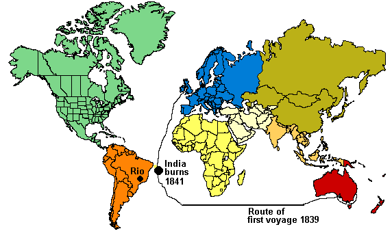 INDIA - Lost at Sea 1841 The barque INDIA sailed from Greenock Scotland on June 4th 1841 carrying 193 bounty immigrants and crew bound for the Australian colony of Port Phillip. On the 19th July, six weeks into the voyage and being some 200 miles from land and 1200 miles from Rio de Janeiro, the ship caught fire and sank. 17 Souls perished in the disaster with the remainder being rescued by the crew of the ROLAND - a French whaling vessel. The survivors were conveyed to Rio de Janeiro where the British Government hired another ship the GRINDLAY to transport them to Port Phillip where they arrived on October 22, some four and a half months after leaving Scotland. Newspaper reports of the day provided a graphic description of the tragedy and the miraculous rescue of almost all those on board the INDIA. |