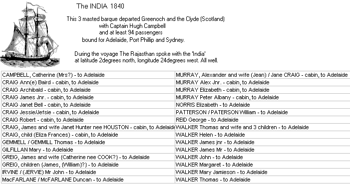 During the voyage The Rajasthan spoke with the 'India' at latitude 2degrees north, longitude 24degrees west. All well. The following was published in the South Australian Register, February 1840. February 23 - The barque INDIA, 493 tons, Hugh Campbell, commander, from Greenock, having left on 5 October, by way of Cork and Porto Prio, with a cargo of sundries. Passengers to Adelaide -- Mr and Mrs Murray and two children, Miss Murray, Mr and Mrs Craig and family, and thirteen in the steerage. For FULL LIST of those who disembarked at Adelaide - CLICK HERE Passengers for Port Phillip and Sydney---Rev Mr Love, his lady and family, Mr and Mrs Gardner, Mr and Mrs Scott and family, Mr and Mrs Mackay and family, Mr and Mrs Scott, Misses Stewart, Julia Campbell, Flora Campbell, Messrs Robert Neill, James Campbell, Godfrey McNeill, N Hill, John Crowe, E. and O. Oliphant, A S Robertson, William McCarthur, Joseph Gillespie, Robert Fitzgerald, Colin Campbell, William Lochhead, J C Gilmore, Thomas Annersley, Thomas Darchy, John Dickson, Robert Wigmore, George and Robert Bell, and a number in the steerage. |