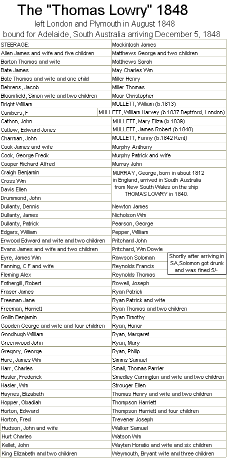 The "Thomas Lowry" was built in 1838 by J.W. Green of Dartmouth for Stringer & Co. of Liverpool (110' x 29' x 7'). Captain Charles G. Pethabridge left London and Plymouth in August 1848 bound for Adelaide, South Australia arriving December 5, 1848.