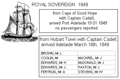 Other voyages during 1849 by a ship of the same name: ROYAL SOVEREIGN from Cape of Good Hope with Captain Cadell, arrived Port Adelaide 19 01 1849 - no passengers reported ROYAL SOVERIGN from Hobart Town with Captain Cadell, arrived Adelaide March 16th, 1849 |