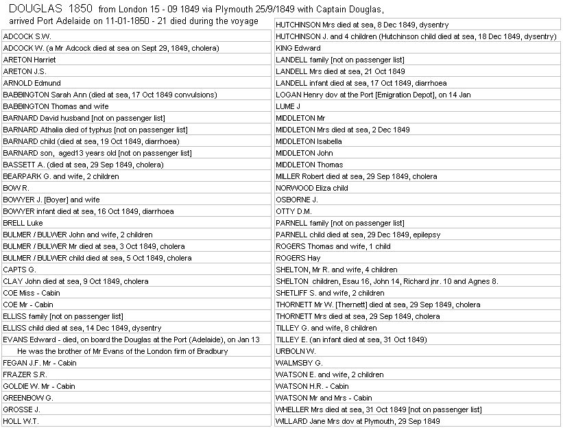 | DEATHS on the voyage to Adelaide. There were several reports in the papers, from both passengers and details from the inquests, that approx. 23 people died. There were conflicting details relating to dates and causes of death (reflected in the passenger list). Cannot relate the child who died October 4th to anyone on passenger list