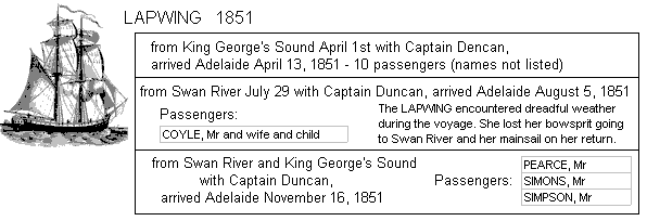 1851 EMU from Port Lincoln with Captain Fraser, arrived Adelaide January 3rd, 1851. Passengers (including 4 shepherds - names not listed).