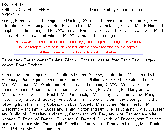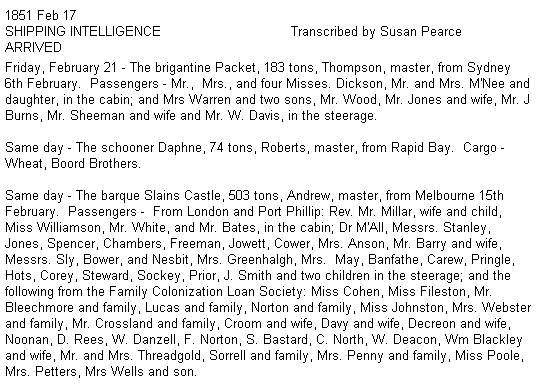 1851 SLAINS CASTLE from London 28 - 09 1850 - Captain W. Anderson, via Melbourne 12/2/1851 arrived Port Adelaide on 21-02-1851 with passengers from London and Port Phillip, and from the Family Colonization Loan Society. SA REGISTER