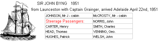 1851 SIR JOHN BYNG from Launceston with Captain Grainger, arrived Adelaide April 22nd, 1851